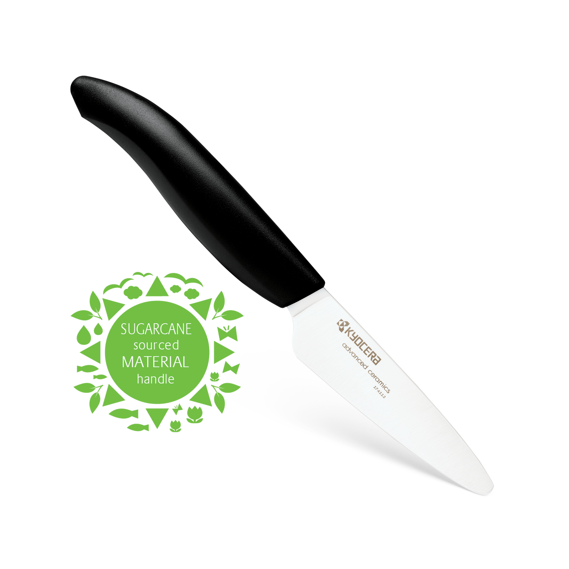 This ceramic paring knife features an ergonomically shaped black handle made from a bio-derived material (sourced from sugarcane) that complements the ultra-sharp white zirconia blades that will never rust. All Kyocera ceramic blades are manufactured in Sendai, Japan in a factory that generates solar power to offset energy consumption.