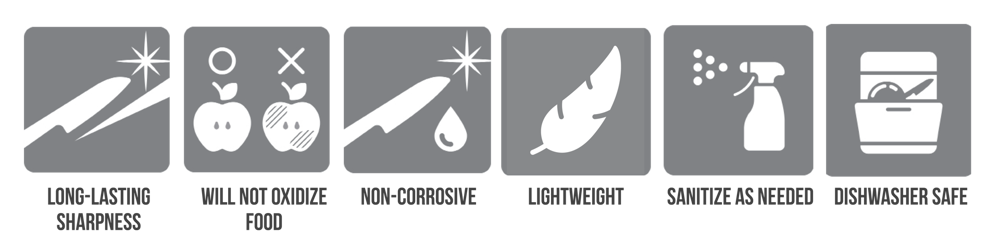 INNOVATIONwhite™ knives are the latest evolution of Kyocera's ceramic knife technology. They are made from a patented blend of zirconia and alumina nano-scale particles fused into an extraordinary ceramic, which doubles the long-lasting sharpness of the original ceramic blades. The knives are resistant to corrosion and staining, and they feature a functional handle design with far better grip ability for different cutting techniques. They are also half the weight of their metal counterparts, making them easy to use and control.
