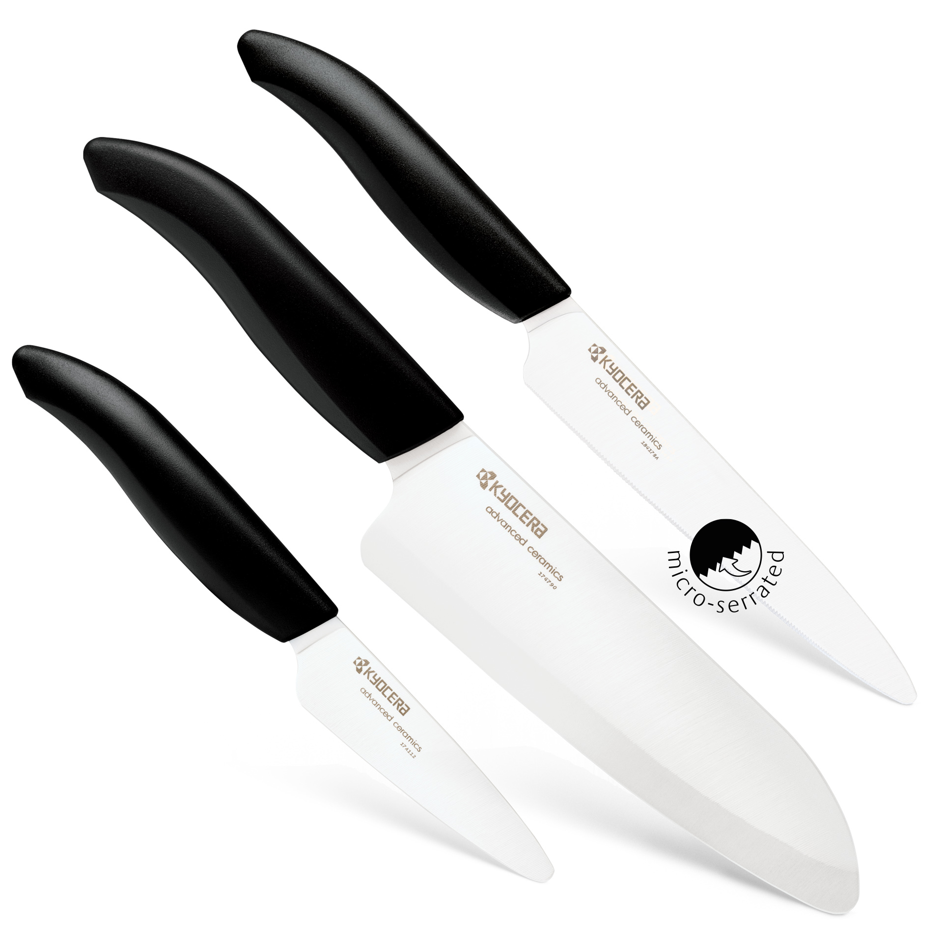 This ceramic knife set includes three essential knives that will cover any home cook preparing fresh meals. The 6" chef's knife is an all-purpose knife for everyday cutting tasks. The 5” serrated knife effortlessly glides through soft waxy skins found on tomatoes and other fruits and vegetables. The 3” paring knife is ideal for detailed tasks like trimming, peeling, mincing and creating garnishes. Ergonomically designed and well-balanced knives for precise control, the ceramic blades are made from Kyocera's proprietary zirconia material produced in Japan and stay razor sharp at least 10 times longer than traditional knives, making them ideal for everyday use.